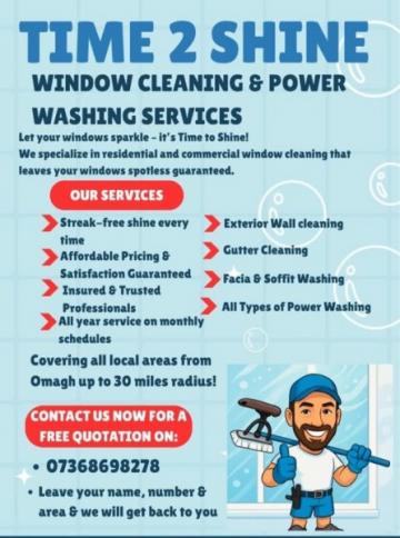 TIME 2 SHINE is a window cleaning and power washing service covering all areas within a 30-mile radius of Omagh.